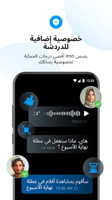 بصفتك مستخدمًا لـ imo Messenger، تتجاوز إمكانياتك مجرد المكالمات. شارك الصور ومقاطع الفيديو لحظيًا، أرسل واستقبل الرسائل الصوتية، وتبادل المستندات بمختلف صيغها (.DOC، .PDF، .MP3، وغيرها) بكل سهولة وأمان. يتميز imo بخصائص متقدمة لضمان خصوصية محادثاتك، حيث يوفر التشفير التام بين الطرفين، الرسائل ذاتية الاختفاء، وحماية الشاشة من الالتقاط والنسخ والمشاركة، مما يمنحك راحة البال التامة عند التواصل بخصوصية. ويمكن مزامنة كل ملفاتك ورسائلك بأمان عبر imo Cloud لتوفير مساحة في هاتفك.
